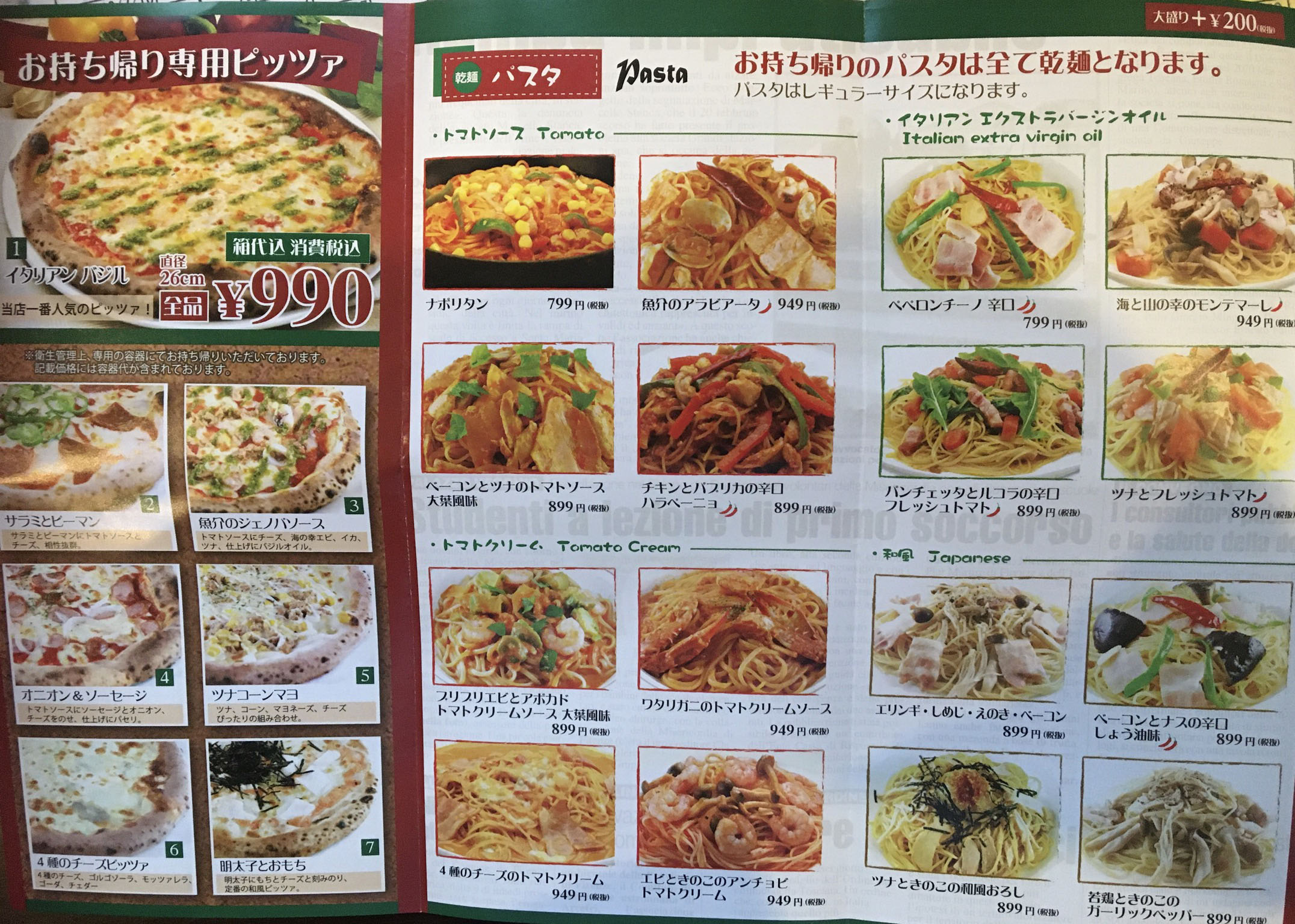 お持ち帰り専用ピッツァは箱代、消費税も込みで990円です!
